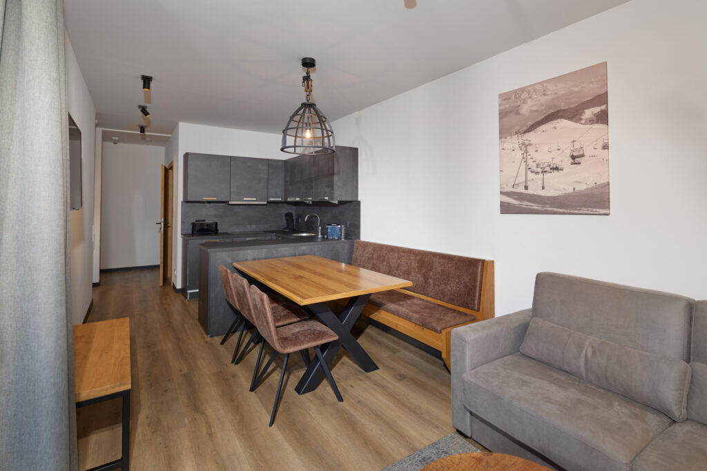 Die Wohnung verfügt über ca. 67 m² Wohnfläche und bietet zwei separate Schlafzimmer, einen großzügigen Wohn-/Essbereich sowie zwei Badezimmer. Die Ausstattung ist hochwertig und auf einen entspannten Aufenthalt im Sommer wie im Winter ausgelegt. Zusätzlich bietet das Resort im Haus über Automaten eine kleine Auswahl an Lebensmitteln für die Grundversorgung – praktisch für die späte Anreise oder den schnellen Einkauf zwischendurch.